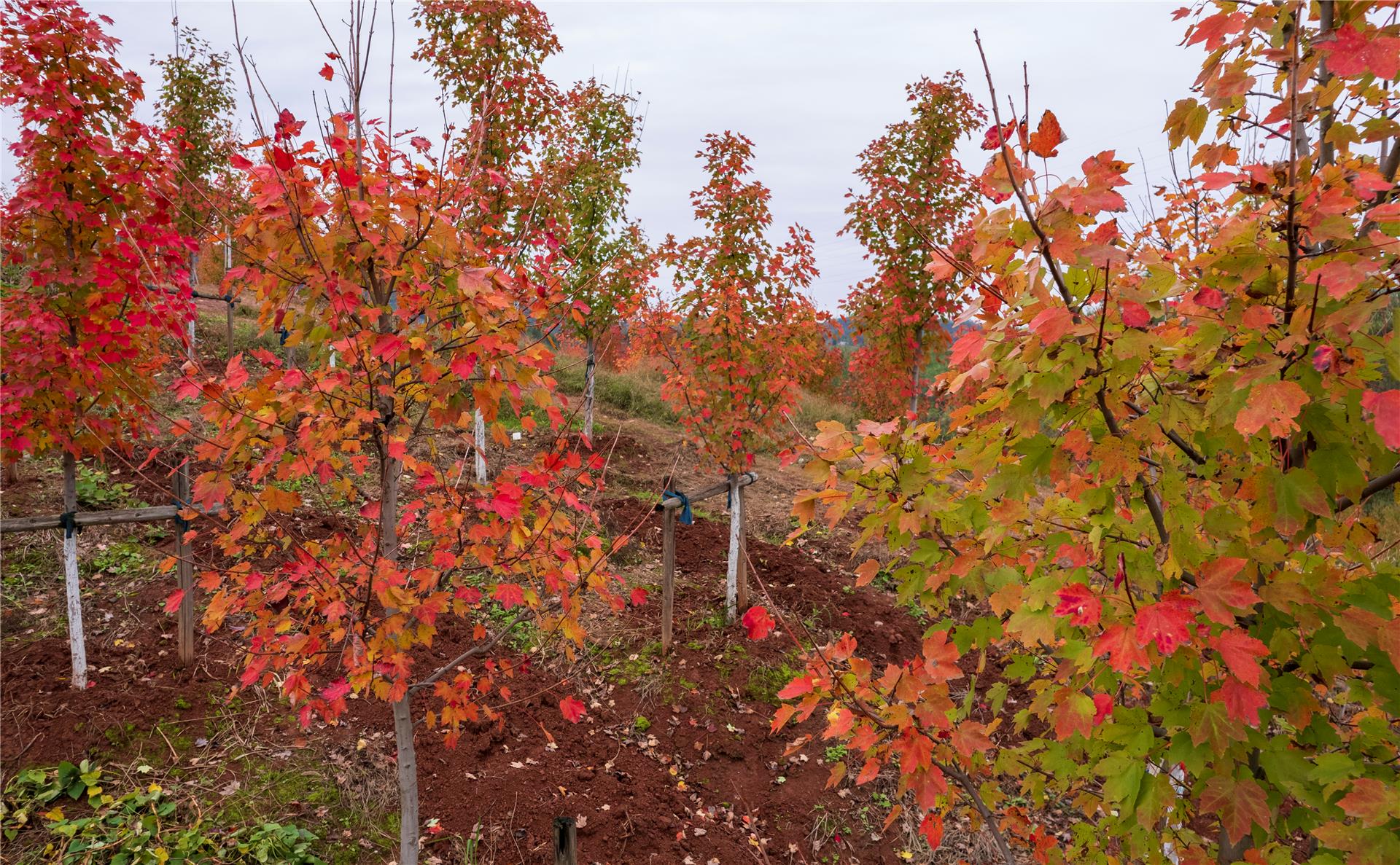 11月26日,銅梁區西郊紅楓基地,一株株紅楓樹陸續換上“紅裝”。不少坡地上的紅楓樹,已經呈現出黃紅、橘紅、淺紅、大紅的顏色,猶如晚霞棲